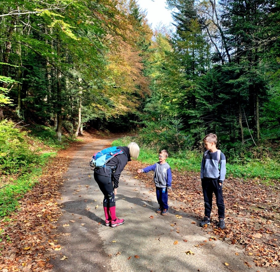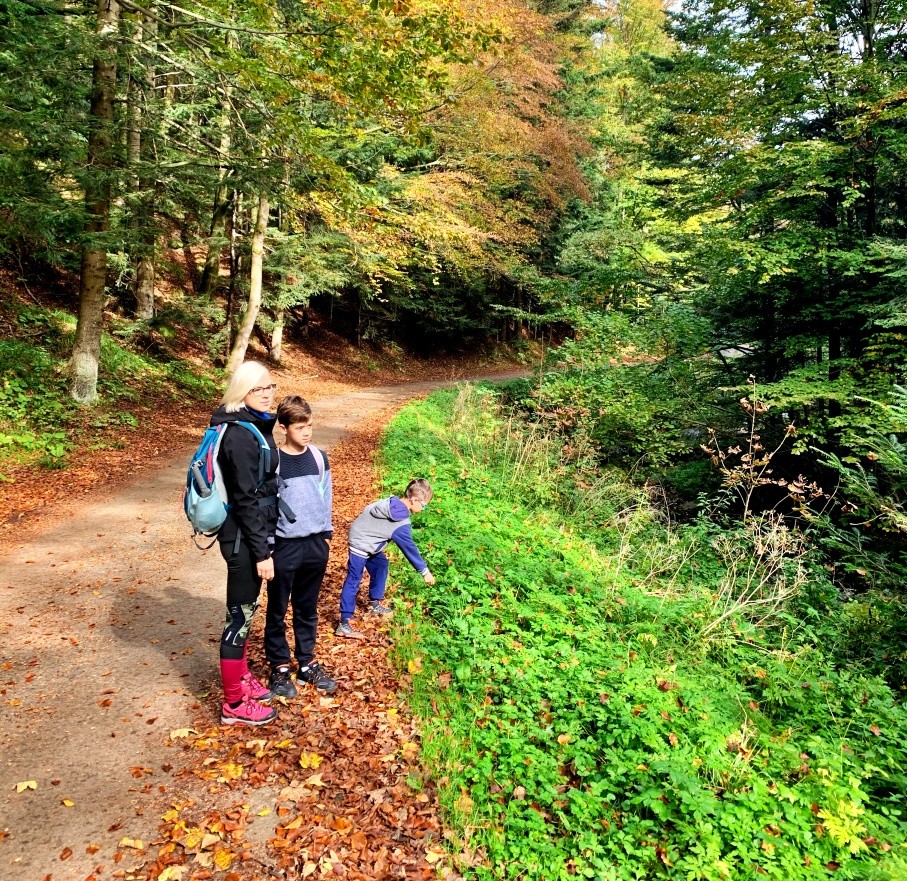 Tego dnia pogoda dopisała, a na szlaku spotkaliśmy sporo grzybiarzy. Nas również interesowały grzyby, ale nie te do koszyka. Postanowiliśmy poszukać tych najbardziej kolorowych i nietypowych. Chłopaków poprosiłam o zadanie: „Przede wszystkim szukamy najbardziej kolorowych lub nietypowych grzybów”. Nie planowaliśmy ich zbierać, a jedynie fotografować – to była nasza misja! Pomysł bardzo przypadł im do gustu i każdy z chłopaków co kilka metrów pokazywał mi swoje znalezisko.